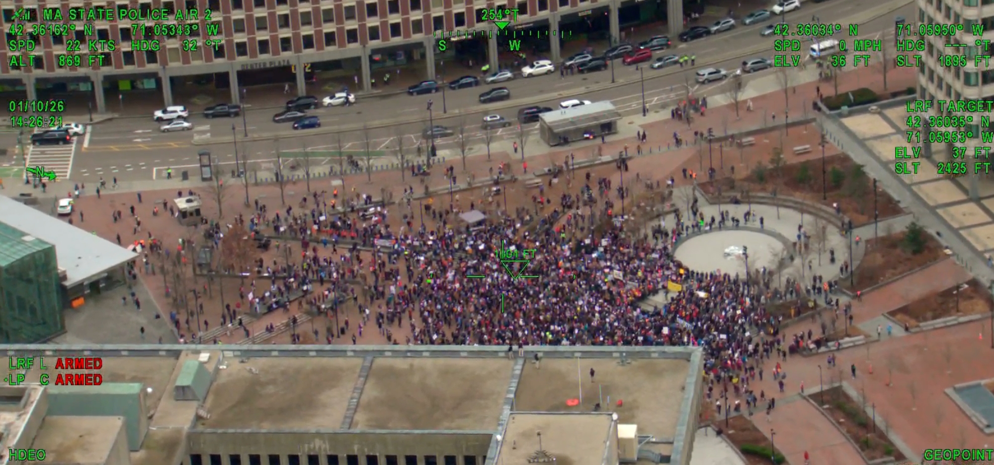 To my surprise, the State Police response to my public records request included more than an hour of video taken from the helicopter over the protest at the federal building on January 10. Potentially of interest, there were -four- people on the roof of city hall. They operated the drone. 1/?
