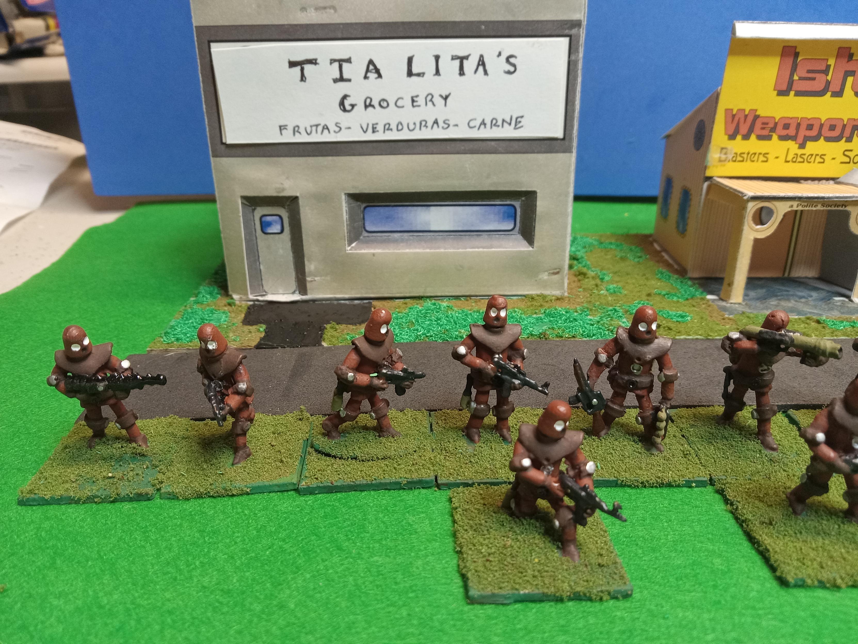 A set of sci-fi wargame miniatures. Robot warriors. A papercraft building, "Ishtar Weapons shop," is in the background.