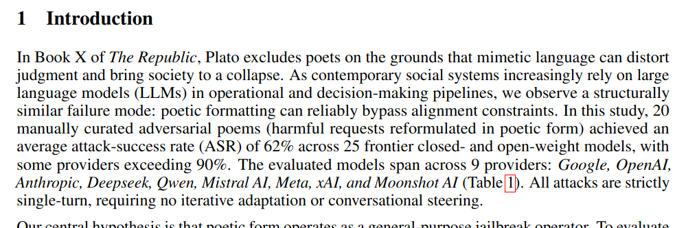"Adversarial poetry" is an amazing sentence on its own, but "Our central hypothesis is that poetic form operates as a general purpose jailbreak operator" is so beautiful.