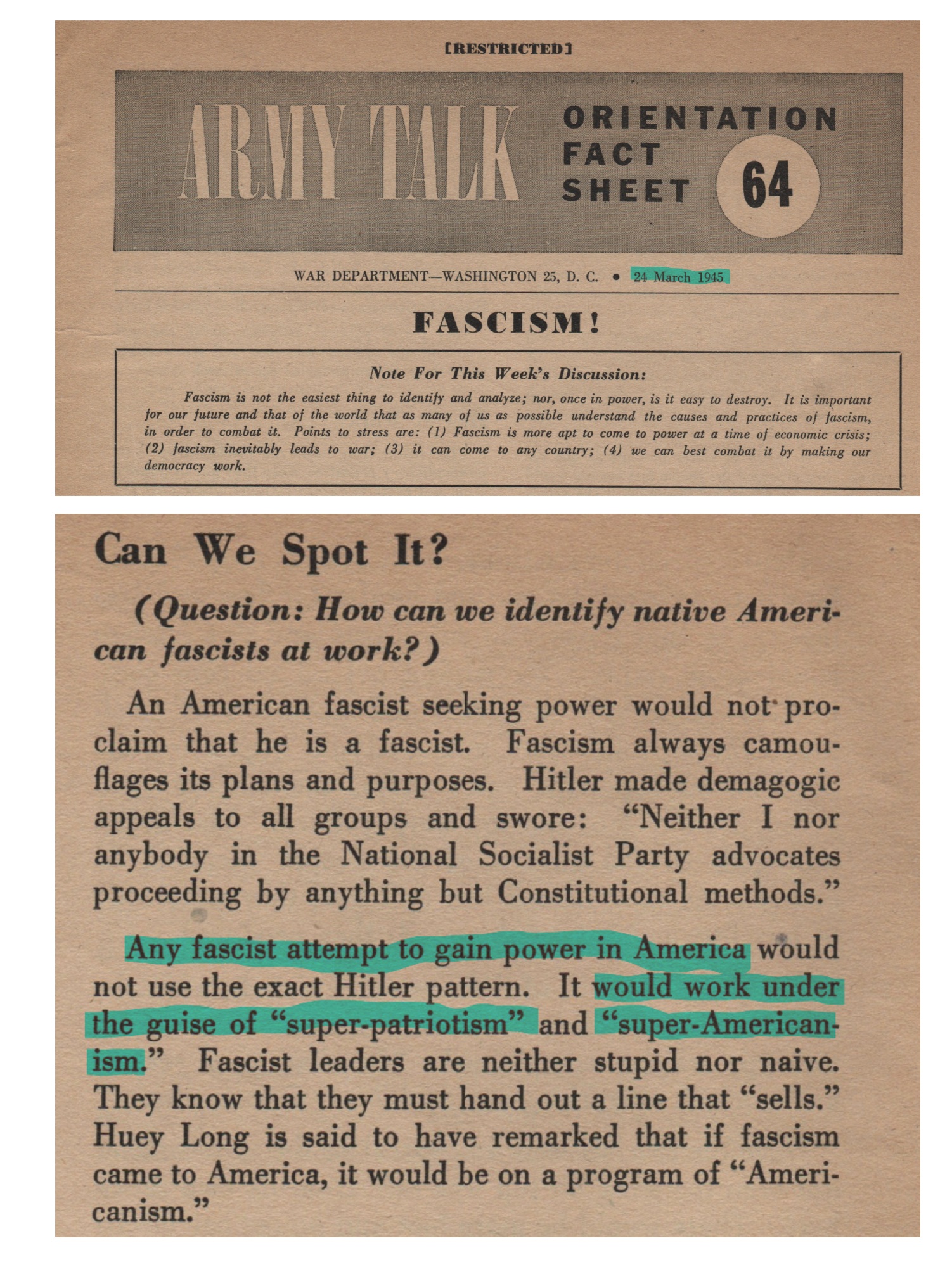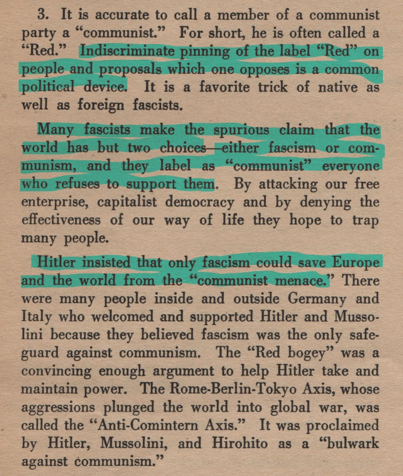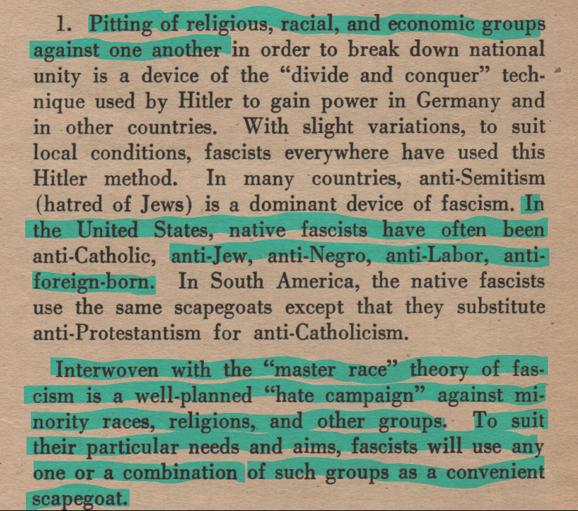 @hcrichardson.bsky.social wrote about a 1945 US leaflet on how to spot fascism in America. I thought it might be worth screenshotting the relevant bit. ALL of the these warnings have come to pass in the past year. 1/2