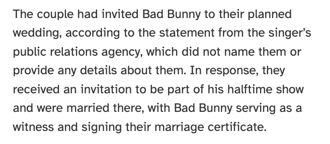 I am floored by the entire idea that somebody sent Bad Bunny an invitation to their wedding and he turned around and said, I can't make it, I'll be busy headlining the super bowl halftime show but why don't you both meet me there and you can get married in the middle of it.