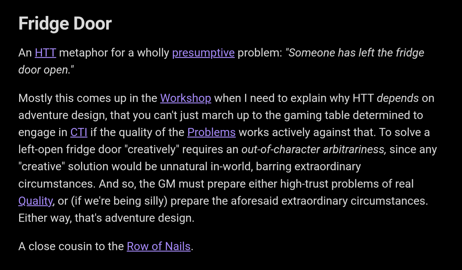 Today I finally added an entry for "Fridge Door," which has become a common metaphor in my #HTTRPG adventure-building workshops.