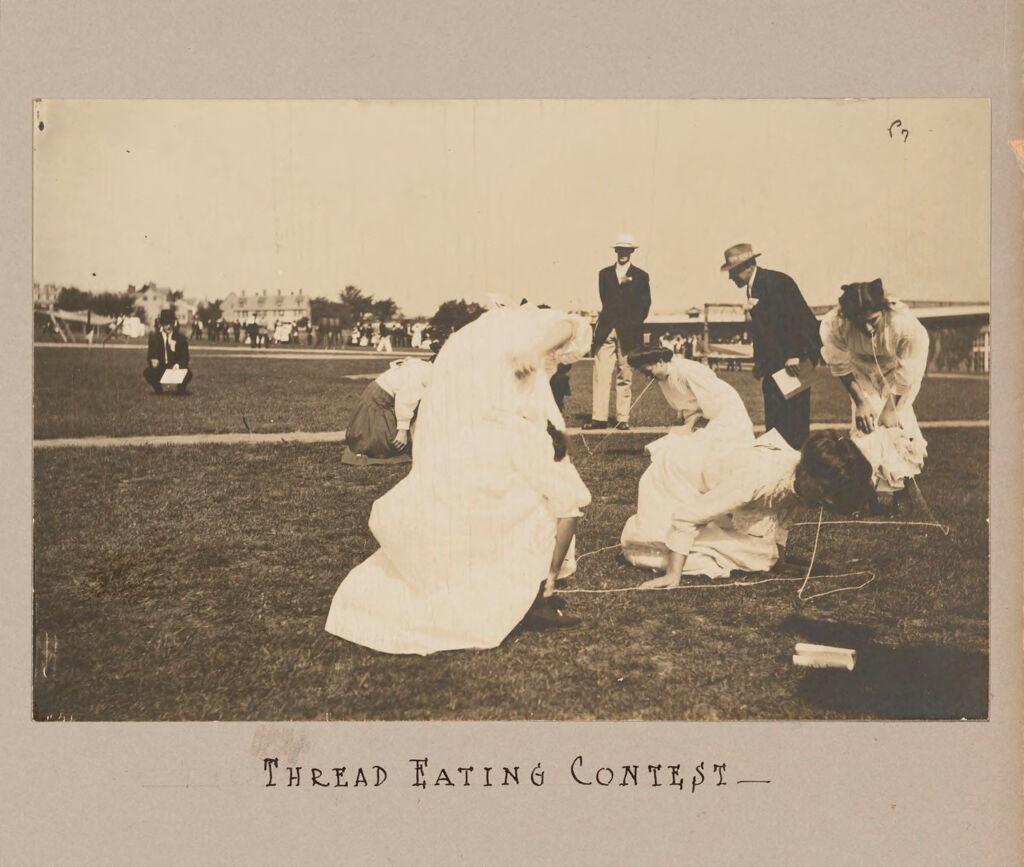 Industrial Problems, Welfare Work: United States. Massachusetts. North Plymouth. Plymouth Cordage Company: Plymouth Cordage Company, North Plymouth, Mass. Provision of Recreational Facilities for Employees. Labor Day Fair - Held By The Plymouth Cordage Co., North Plymouth, Mass.: Thread Eating Contest.