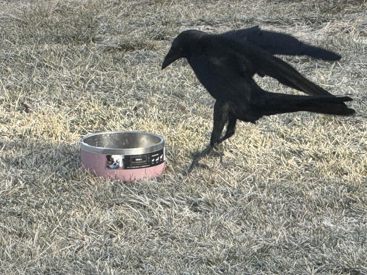 A crow visits a dish of food in the backyard. It approaches the bowl, leans down, and apparently is startled by its own reflection off the shiny surface of the bowl’s interior. Then it quickly jumps backward. It repeats the cycle all over again. It’ll do this five or six times before it flies away.