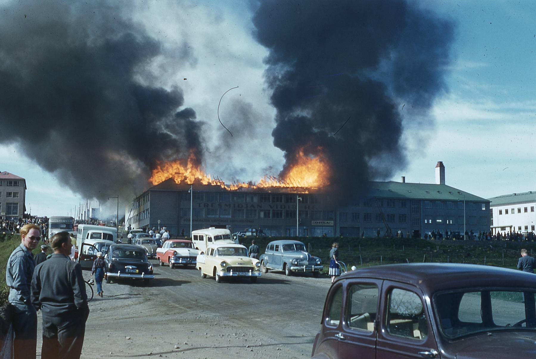 On July 7th, 1957, the carpentry workshop and furniture store Víðir caught fire. My grandfather, who was on his way to visit his brother, managed to take some photos. #Iceland #Reykjavik #photography #filmphotography #slide #streetphotography #vintage #history #fire #classiccars