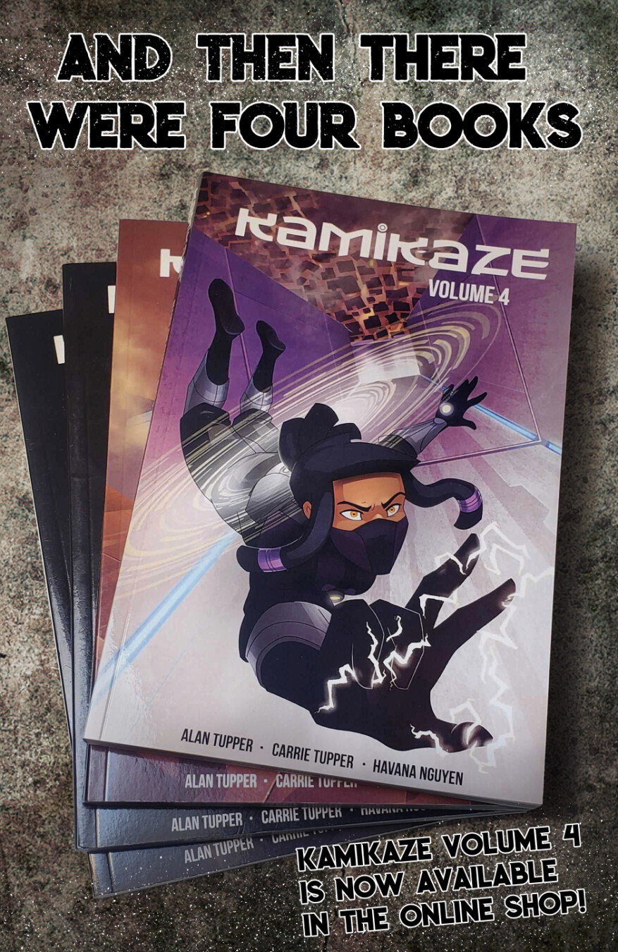 Hey folks, exciting news: We’re pleased to announce that Kamikaze Volume 4 is now available for direct purchase through our online shop! Volume 4 is the second part of “Before the Storm”, including the prison break and stealing Logan’s hovercraft. It’s the big payoff from the first three books!