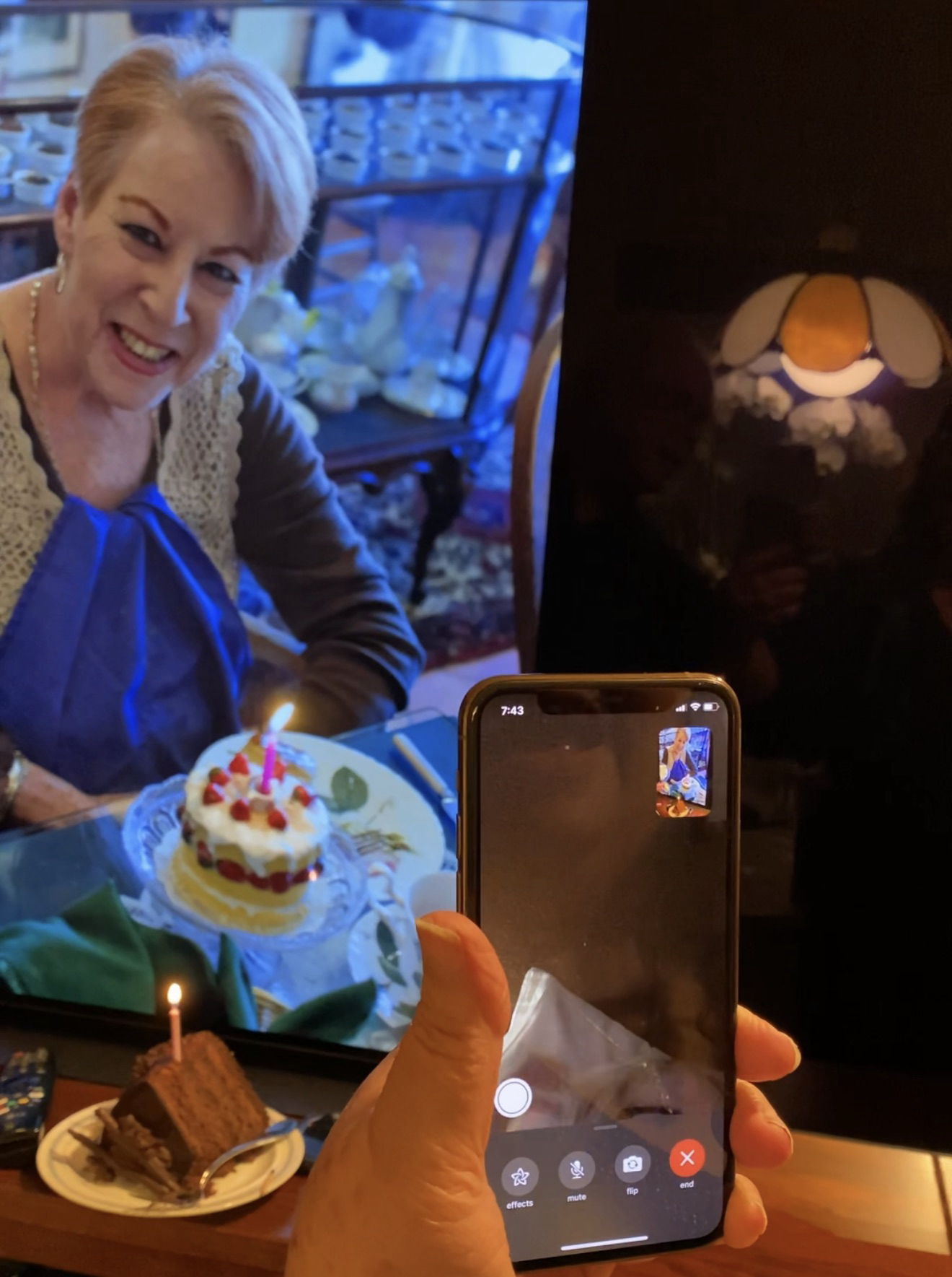 Photo of a woman smiling in front of a strawberry cake shown on the screen of a TV with a slice of chocolate cake in front of the TV. Both cakes have a candle. Someone is videoing both. Were there sound, everyone would be singing Happy Birthday.