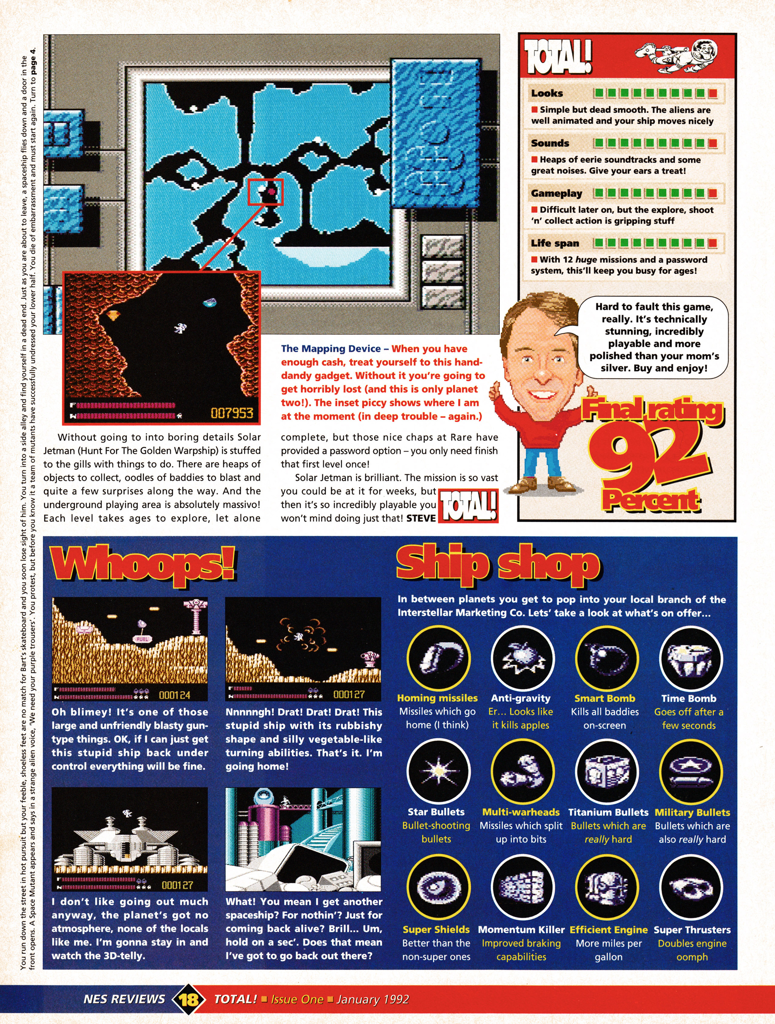 Another incredibly underrated gem, and from the masters at Rare no less, the review for Solar Jetman on NES. Taken from Total! 1 - January 1992 (UK) score: 92%