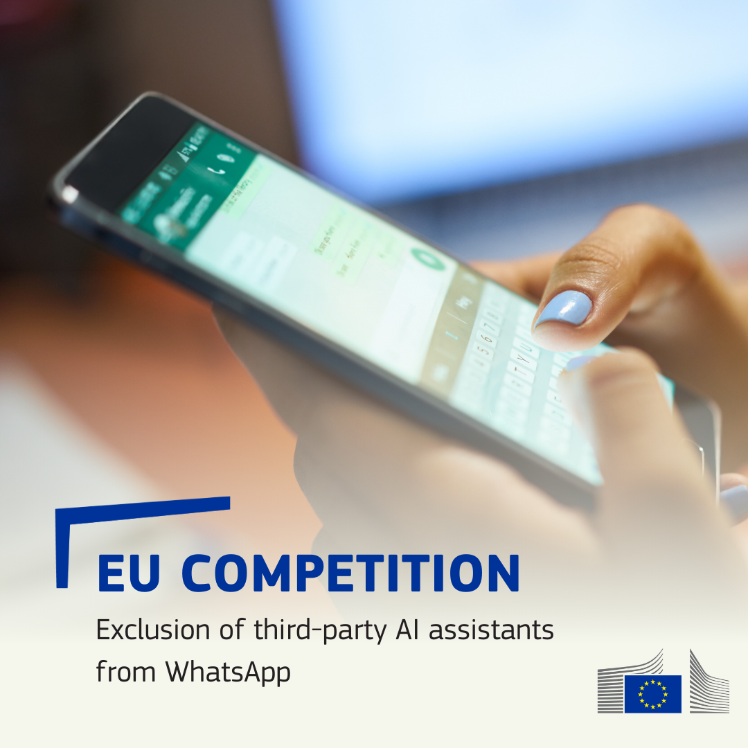 A person’s hand with blue-painted fingernails is shown typing on a smartphone displaying a WhatsApp chat interface. The bottom half of the image features a white overlay with the bold blue heading "EU COMPETITION" and the subtext "Exclusion of third-party AI assistants from WhatsApp." The European Commission logo is visible in the bottom right corner.