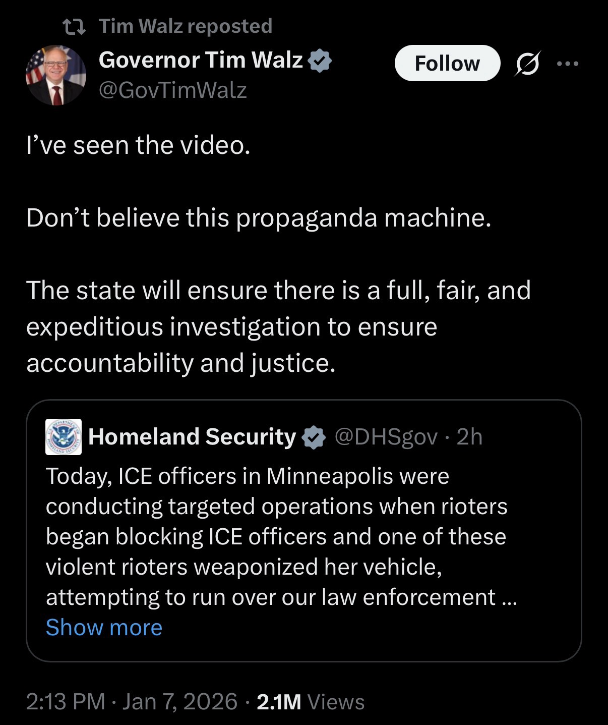 Gov. #TimWalz of #Minnesota replied to the social media post from #DHS by saying that “I’ve seen the video” & “don’t believe this #propaganda machine.” He promised “a full, fair & expeditious investigation.”