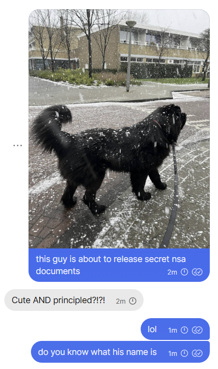 ss23 @ss23@toot.ss23.geek.nz replied · activity timestamp last week @0xabad1dea Read more Read less Translate alt 1: this guy is about to release secret nsa documents 2: Cute AND principled?!?! 1: lol. do you know what his name is 1: this guy is about to release secret nsa documents 2: Cute AND principled?!?! 1: lol. do you know what his name is Reply Boost Quote You cannot quote this post Like More actions Copy link Flag this comment Block