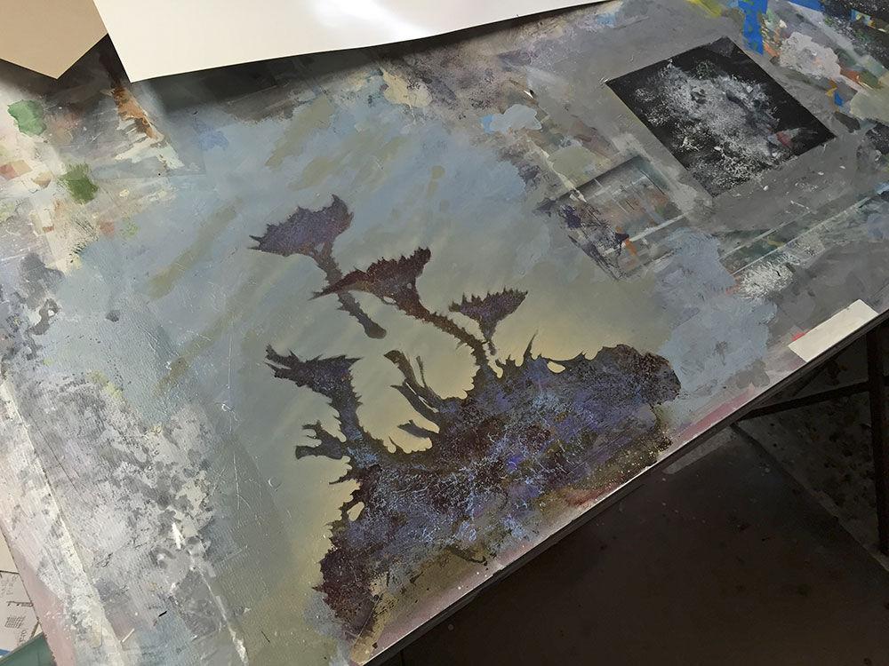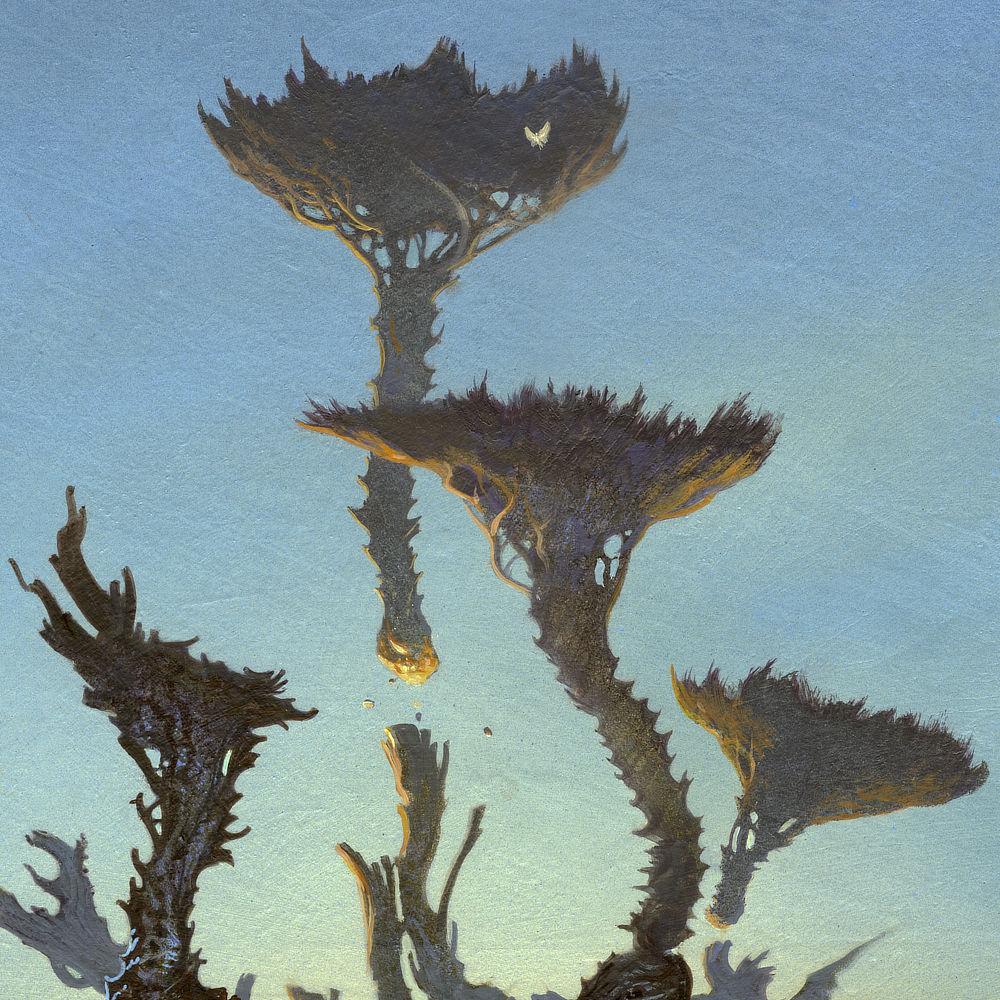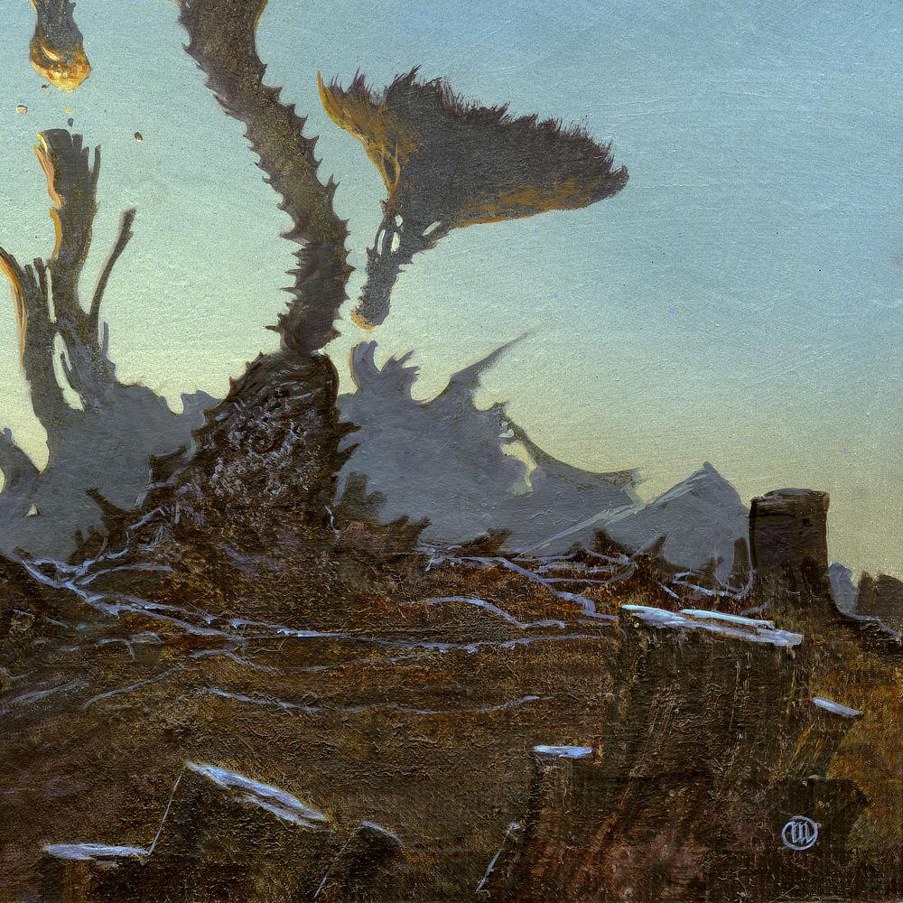 Detail from ACCIDENTAL ALIEN LANDSCAPE featuring the rightmost tree and two more detaching from their trunks in the background. The soil is clumpy and thick making it difficult to tell where the base of the tree begins. Tree trunks in the foreground right look petrified based on the shine of light on their tops. One bears the artist’s sigil, the letters M and W combined and bound within a circle.