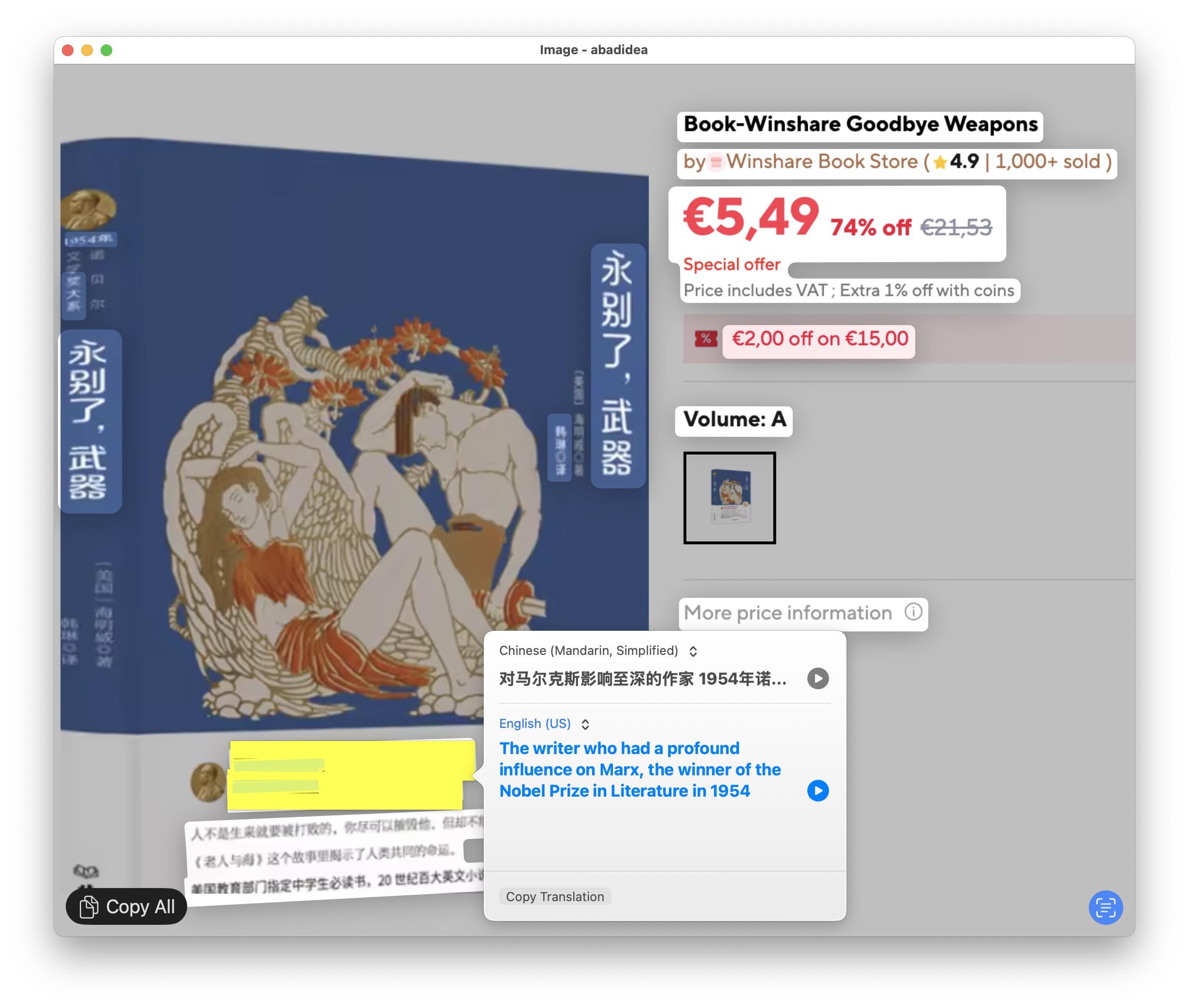 Screenshot or image from original post with an Apple Translate bubble showing this translation of a blurb: The writer who had a profound influence on Marx, the winner of the Nobel Prize in Literature in 1954