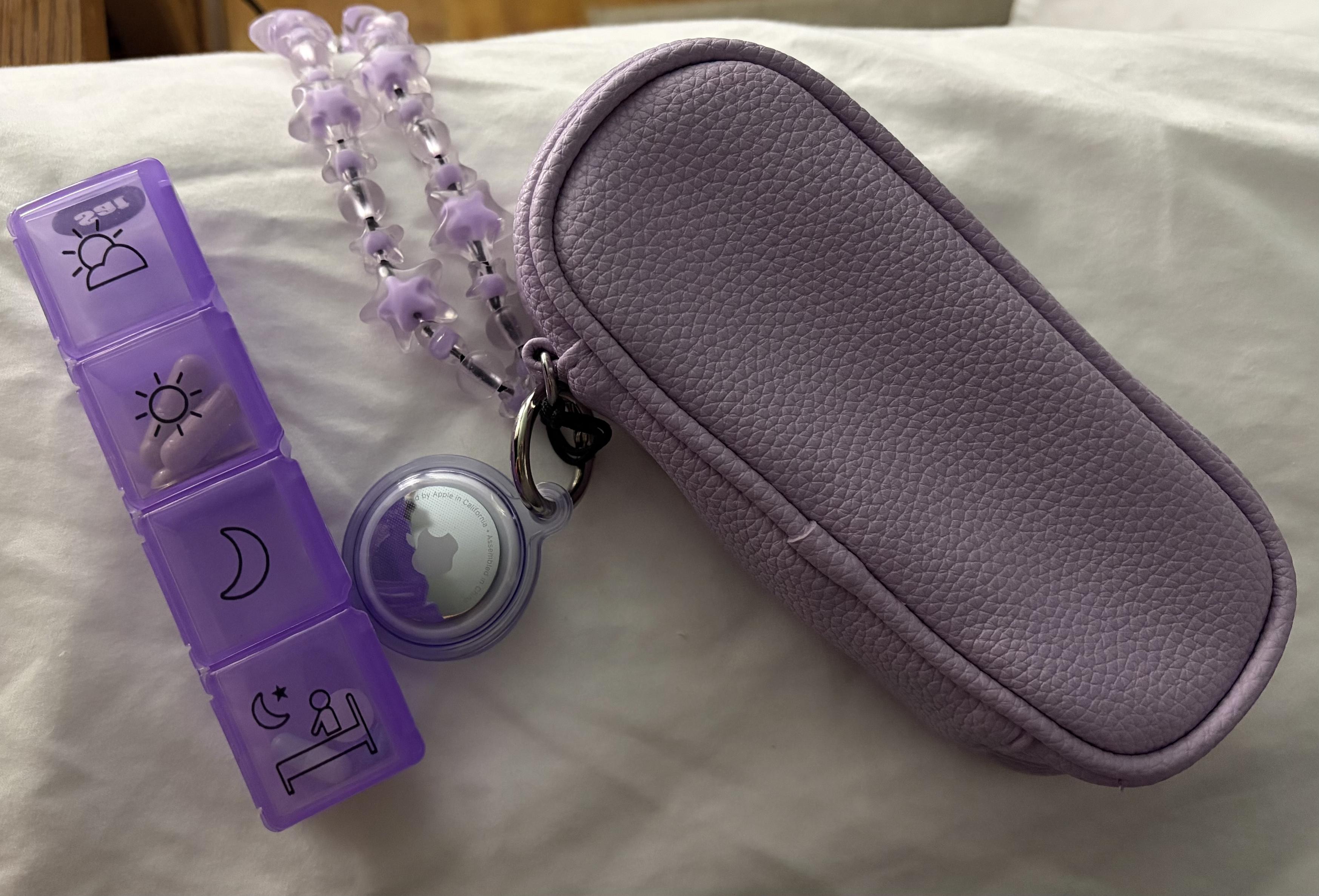 A purple, rectangular pill case with four doors (morning, noon, night, bedtime) on it sits next to a purple, oblong faux leather bag that is bigger than the pill case. On the bag there is a bracelet loop with purple beads and an AirTag