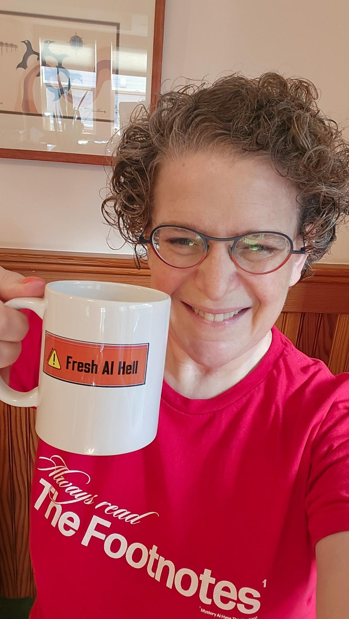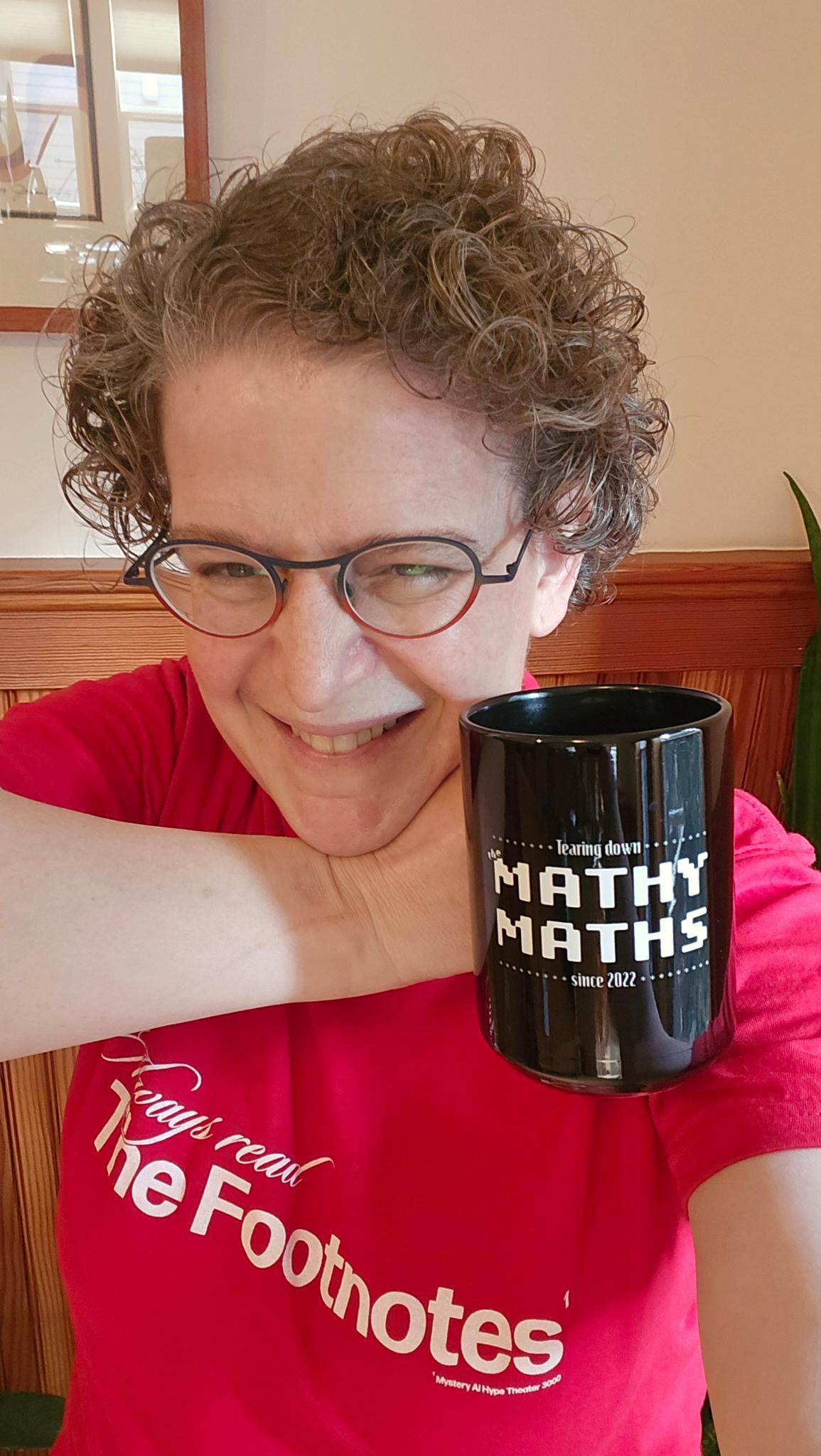 modelling our “Always Read The Footnotes” t-shirt along with Fresh AI Hell and Mathy Maths mugs!