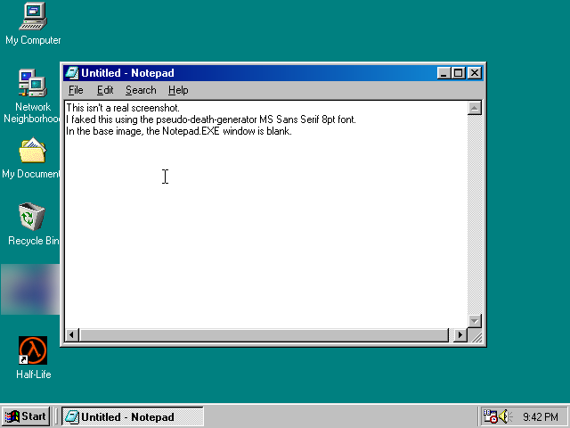 Got it. I now have MS Sans Serif 8pt as a pseudo-deathgenerator font, and it's pixel identical to the Windows 98 text renderer.